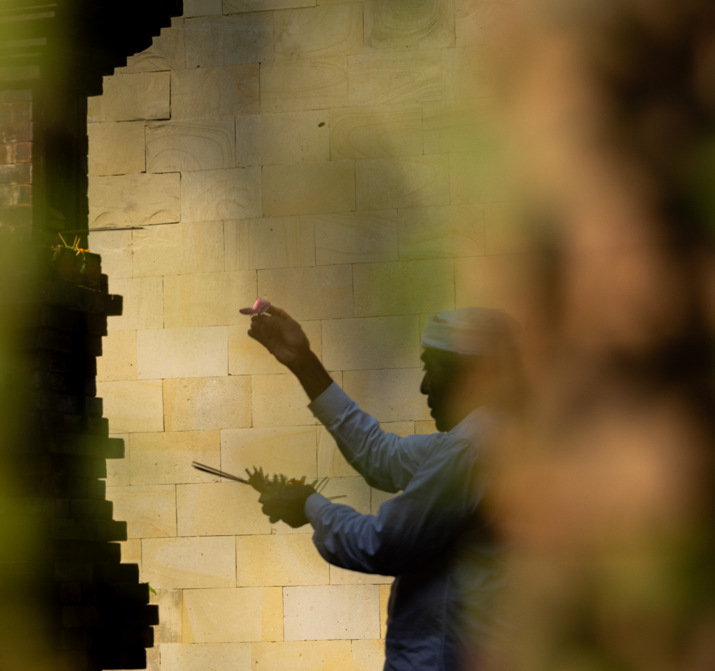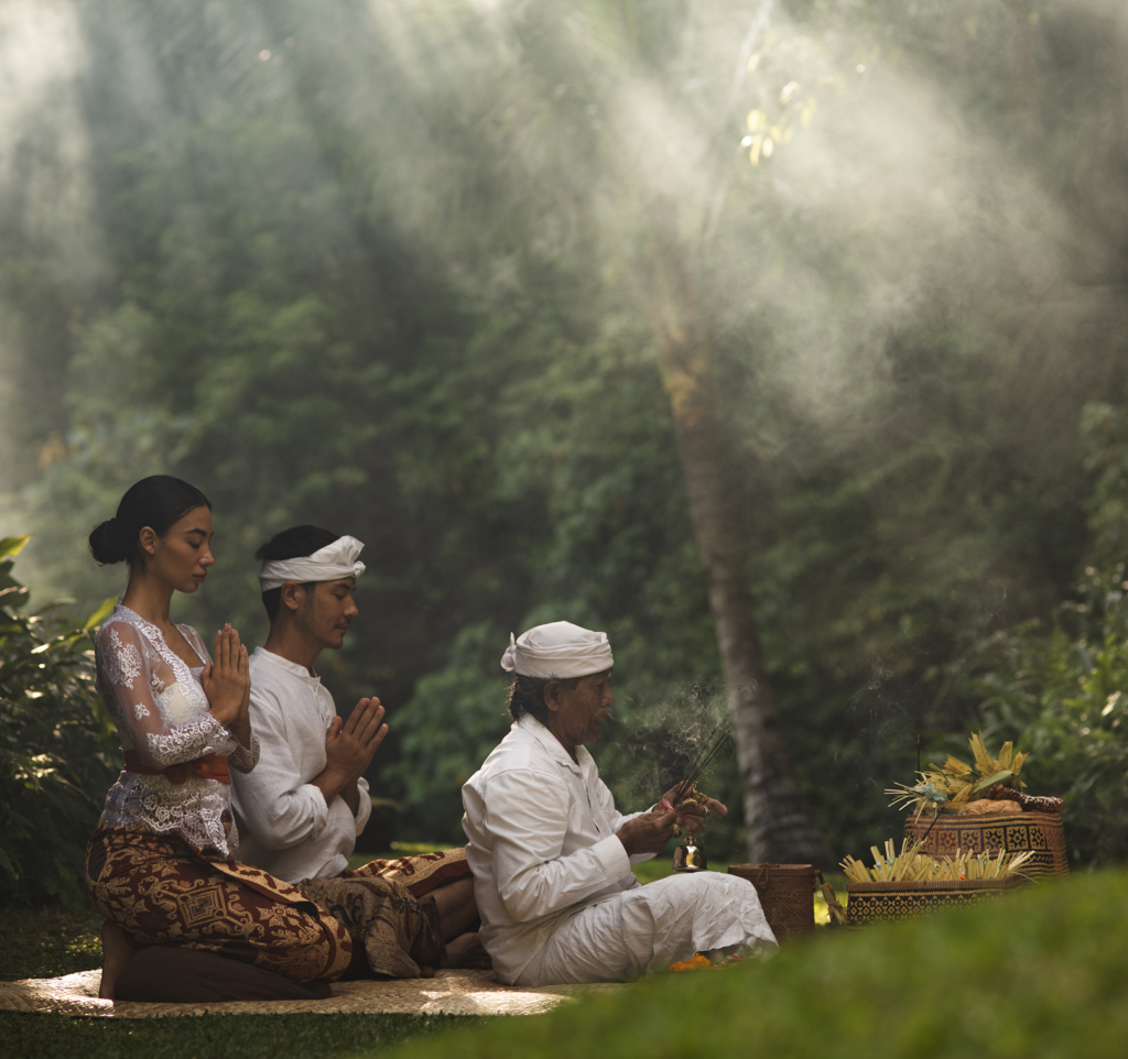 It culminates in Melukat, a water purification ceremony led by a local priest and accompanied by the resonant tones of live Gamelan music. Water flows over the skin as symbolic cleansing, marking the transition into a new cycle.