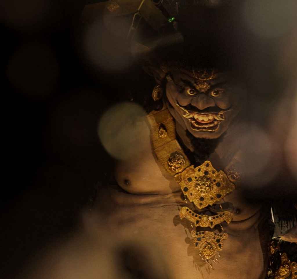 The streets fill with Ogoh-Ogoh,  towering effigies representing negative energies,  carried in procession through smoke, fire, and percussion before symbolic purification. At Mandapa, the central figure is Bhuta Wingkara, a fearsome presence from the underworld, accompanied by representations of a wild dog and a boar. This is not decorative folklore. It is cosmology,  the coexistence of humanity, nature, and unseen forces.